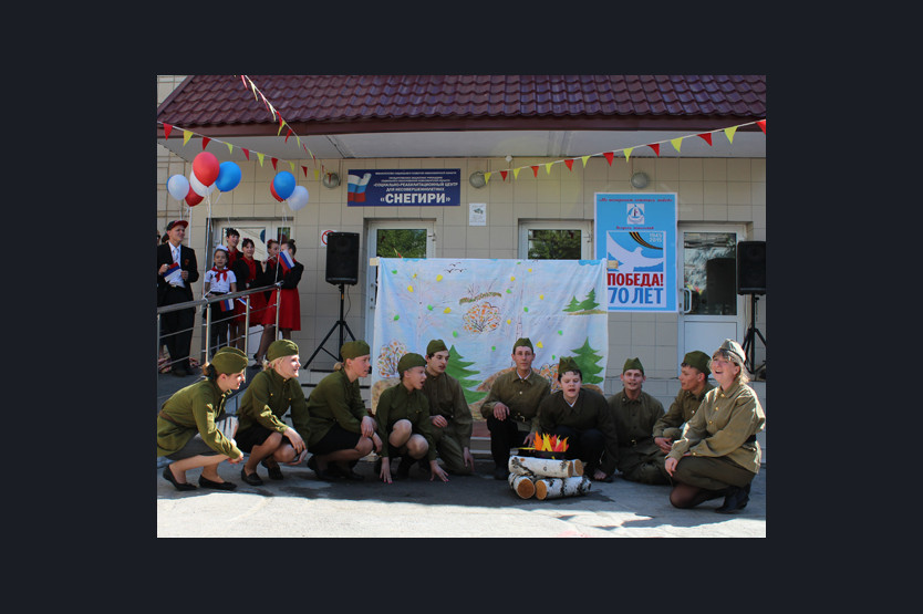 Ребята из Центра «Семья» показали отрывок из спектакля «А зори здесь тихие». Калейдоскоп выступлений продолжили ребята из Коченевского района с песней «Мир вам люди всей земли» и танцевальной композицией «Возвращайтесь». Очень трогательно прозвучала «Баллада о матери» в исполнении Марии Осинцевой и инсценировка песни из к\ф «Небесный тихоход» в исполнении мальчиков из Чановского района. Продолжили программу воспитанники Ояшинского детского дома интерната. Они подготовили инсценировку стихотворения Б.Богаткова «Перед наступлением» и песню «А закаты алые». Завершила концертную программу литературно-музыкальная композиция «Этот День Победы…»в исполнении ребят Мошковского района, одетых в военные гимнастерки.